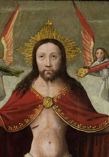 Middeleeuws schilderij over rechtspraak, met het Laatste Oordeel, een rechtszaak en een waarschuwing tegen omkoping en oneerlijke rechtspraak.